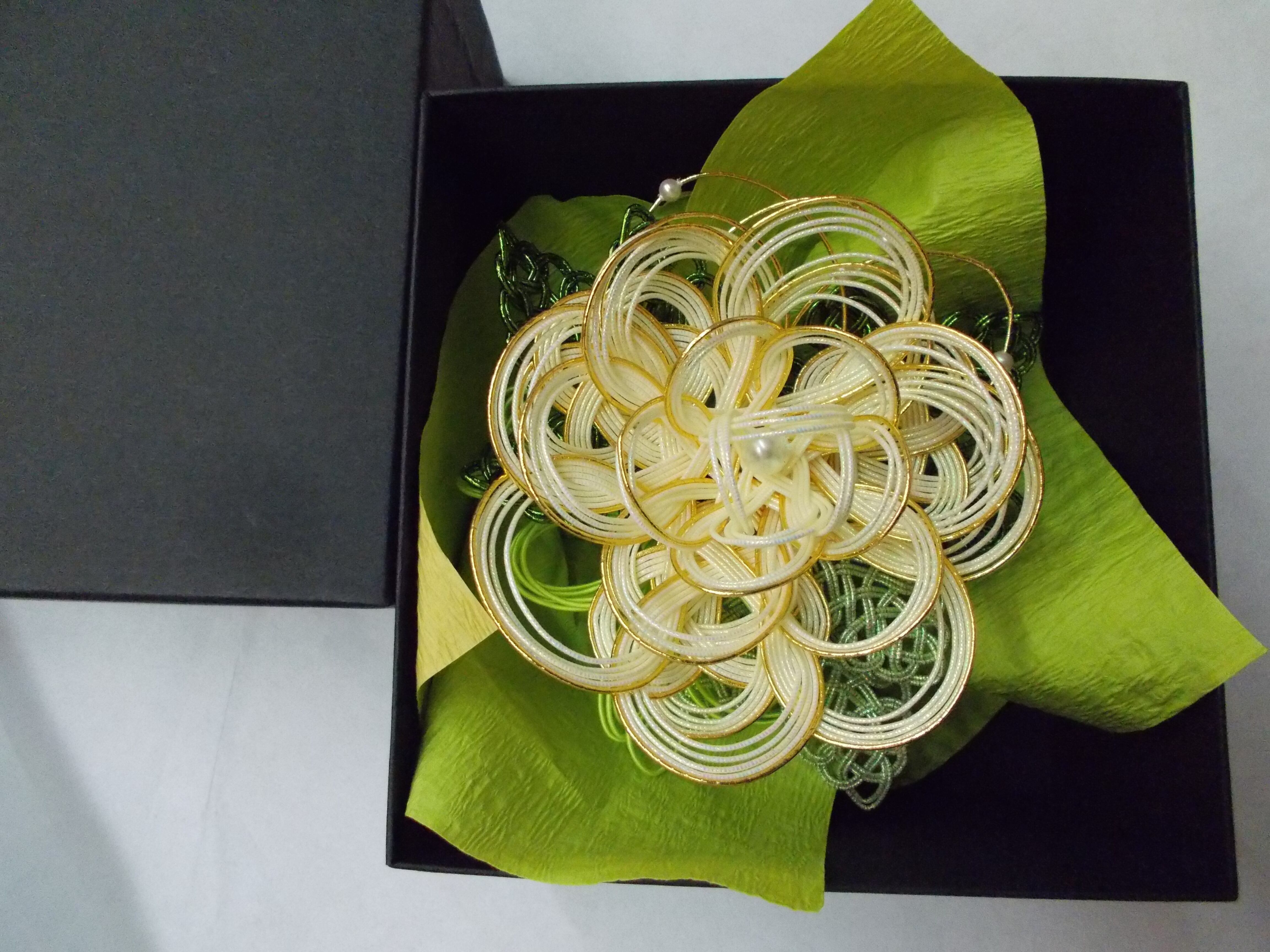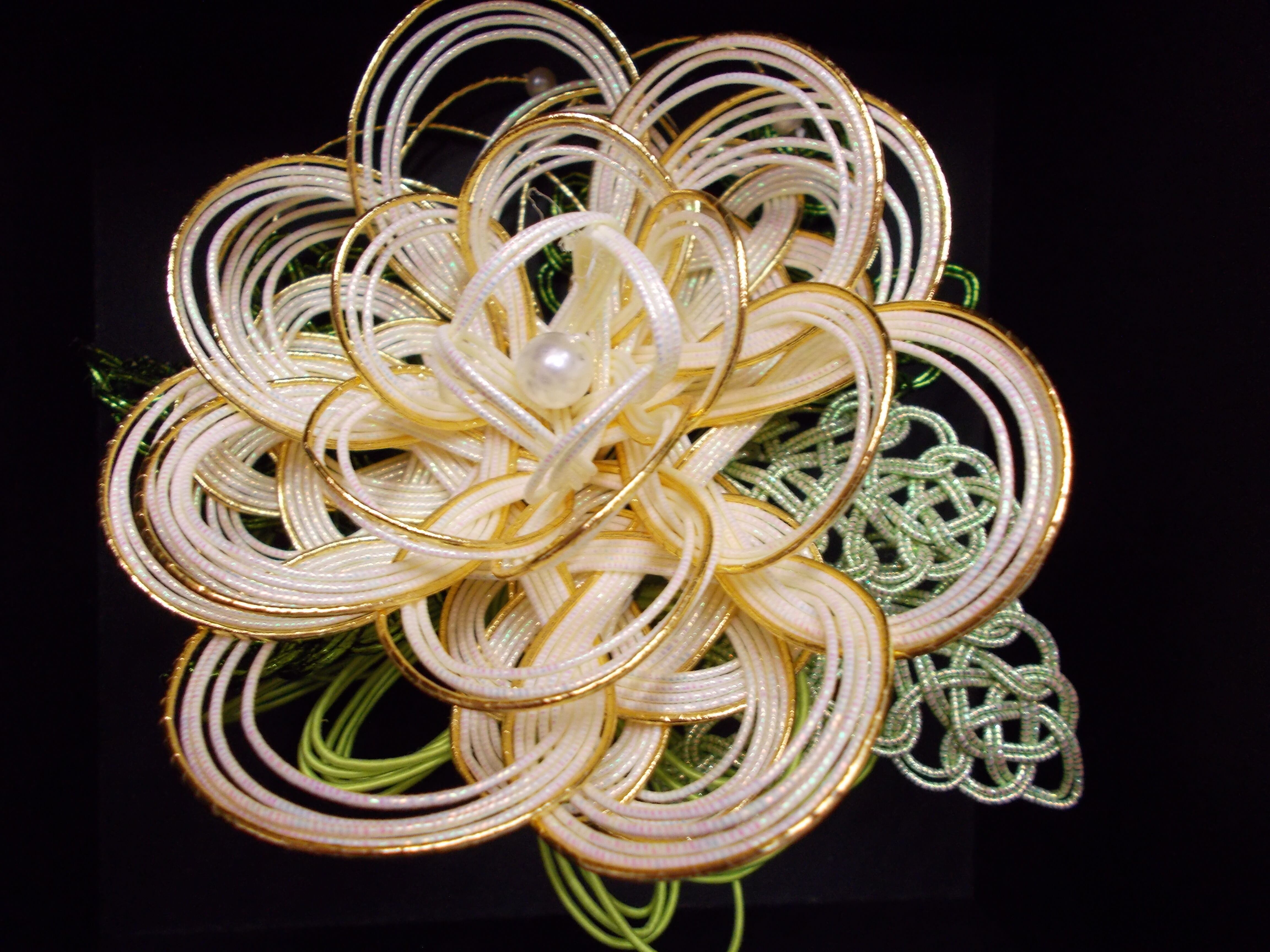 水引で作っています。上品な光沢のある羽衣水引を使用しています。入学式やパーティーに。