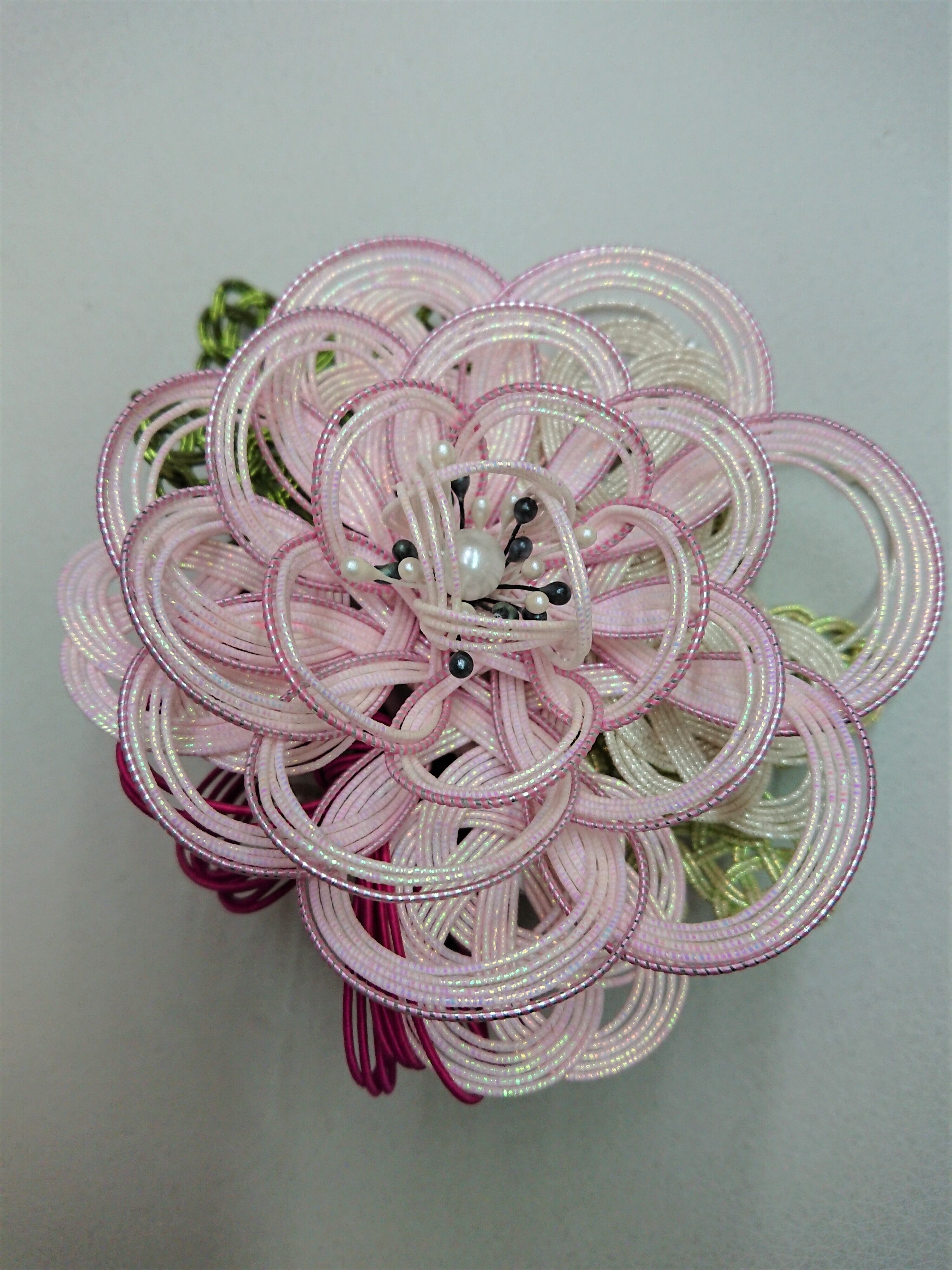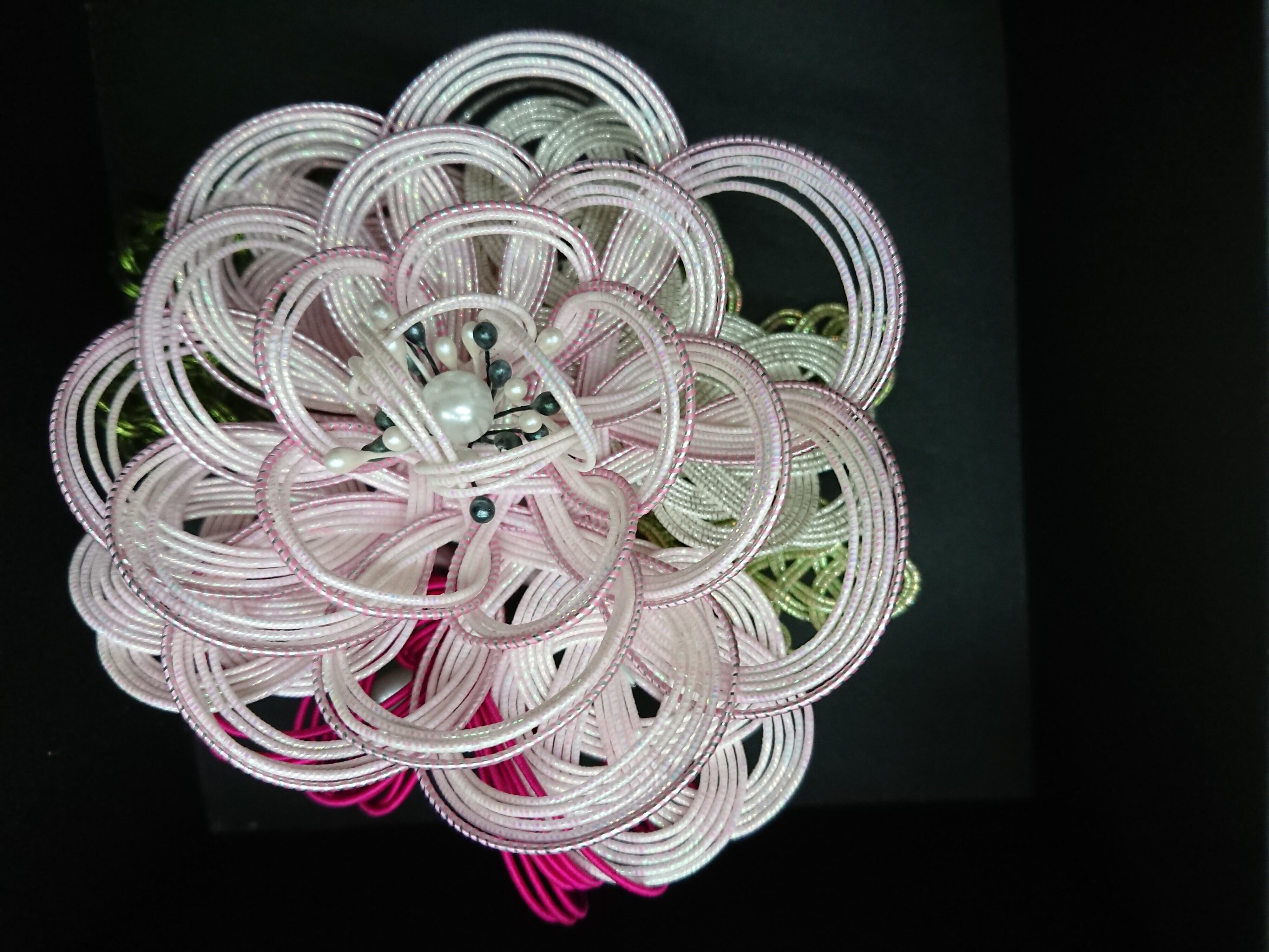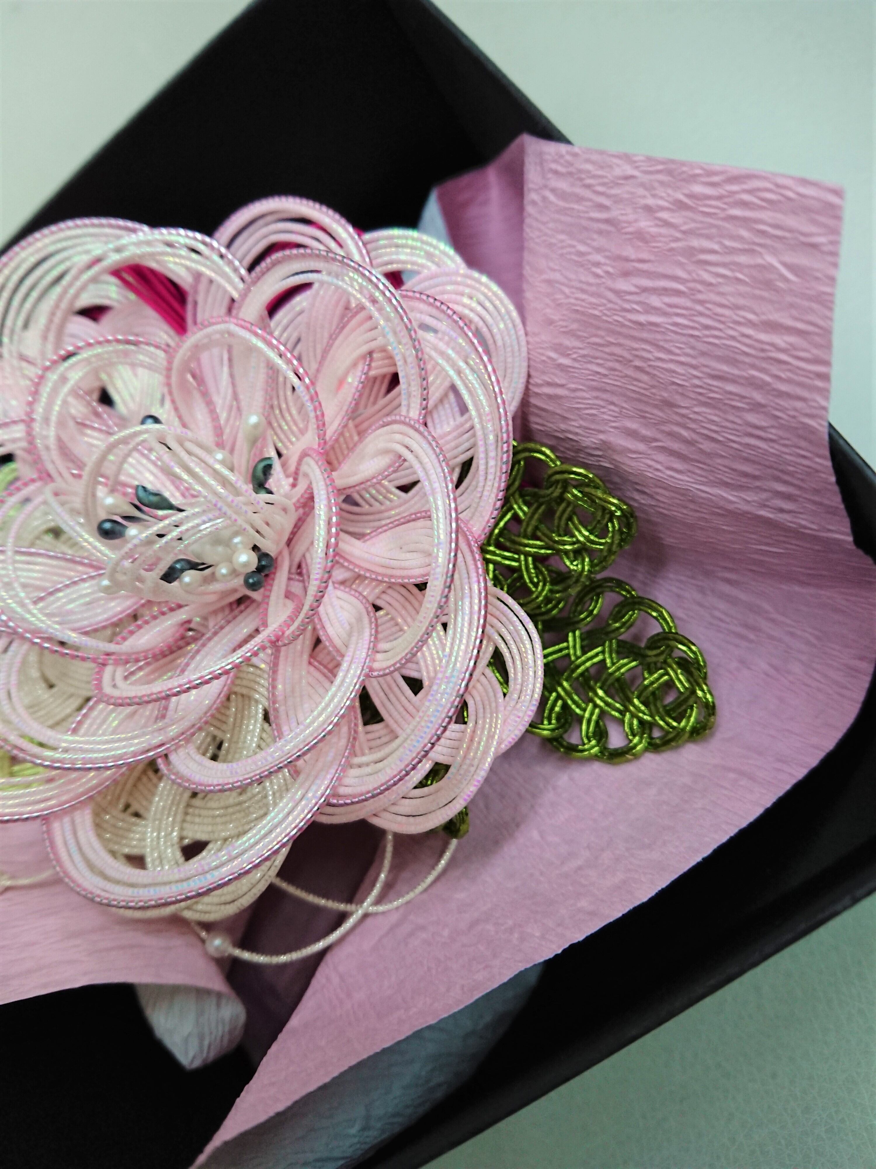 水引で作っています。上品な光沢のある羽衣水引を使用しています。入学式やパーティーに。