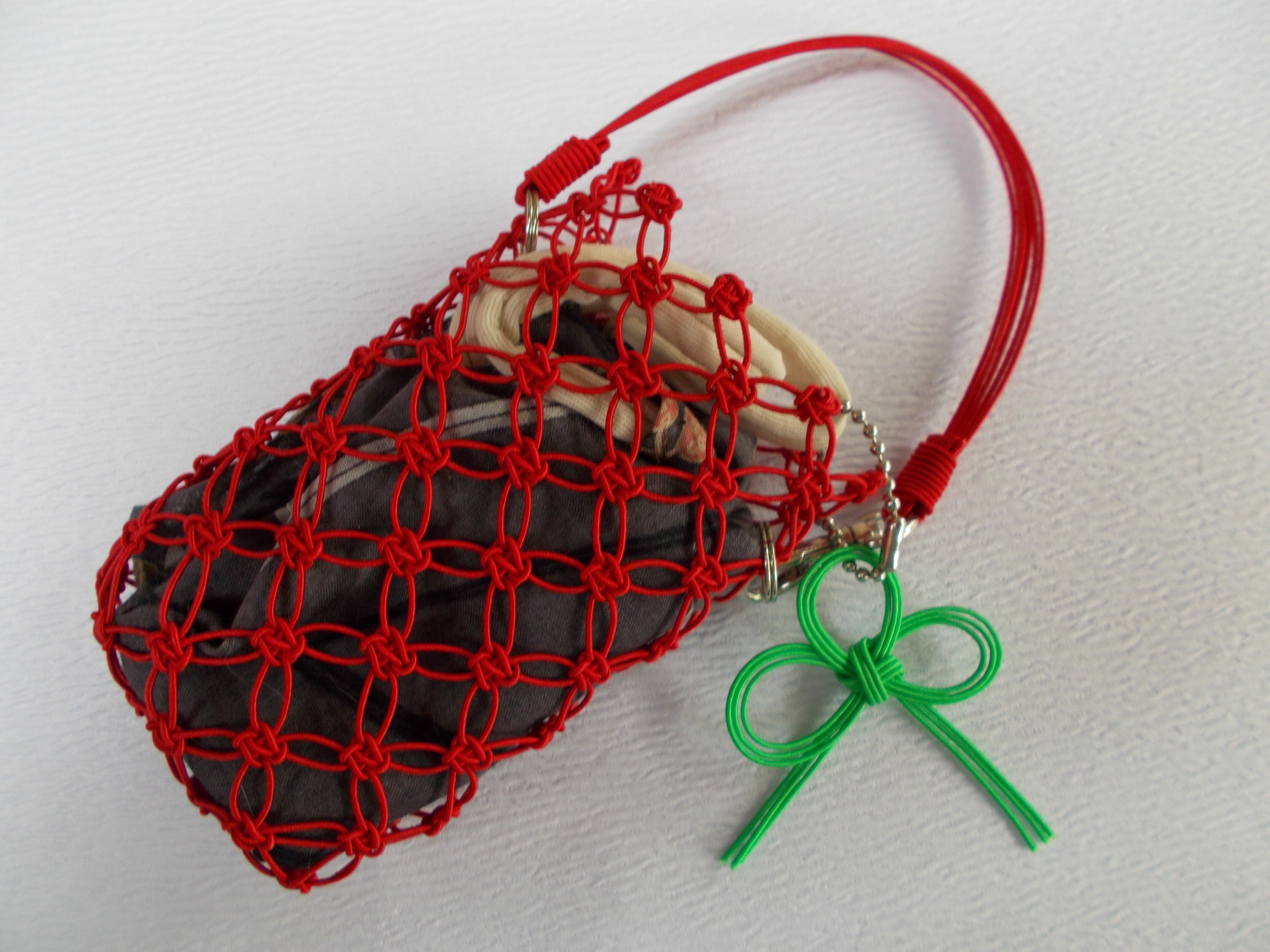 七宝結びで小さなバッグを作りました。水引で作るとわりとしっかり形が整います。曲げても元に戻ろうとする力(張り)があるのでプワっとしています。